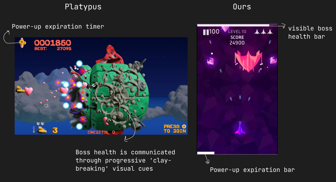 What I found Platypus lack is sense of progress when beating boss. Sure, the boss health is communicated through progressive ‘clay-breaking’ visual cues, but sometimes it’s not enough for higher-level boss fights with massive amount of health. Moreover, showing power-up expiration timer in the form of numbers might be too excessive.