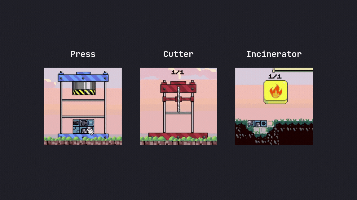 Players are required to think outside the box by using machines (hydraulic press, cutter, and incenerator) to reshape the waste.
