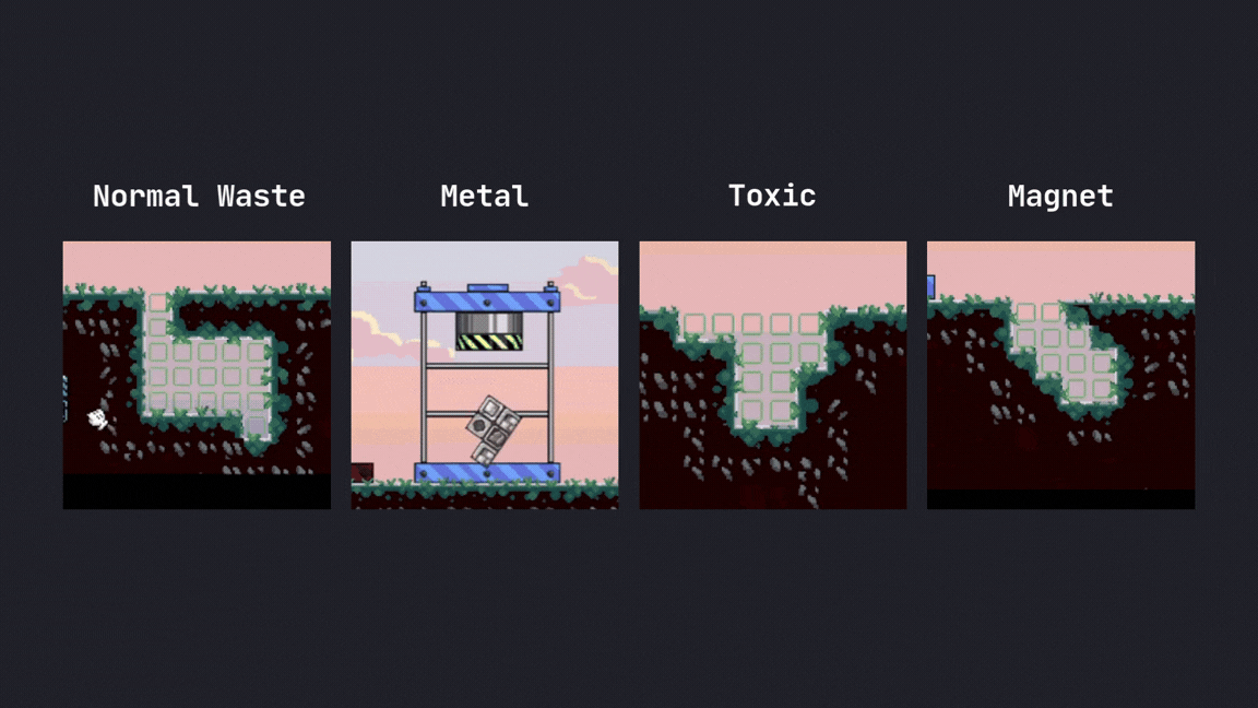 Waste Crusher is a puzzle game where the players work at waste management site and they need to strategically fit waste into a landfill. The game features a tile-based grid where players arrange variety of waste types (normal, metal, toxic, and magnets).
